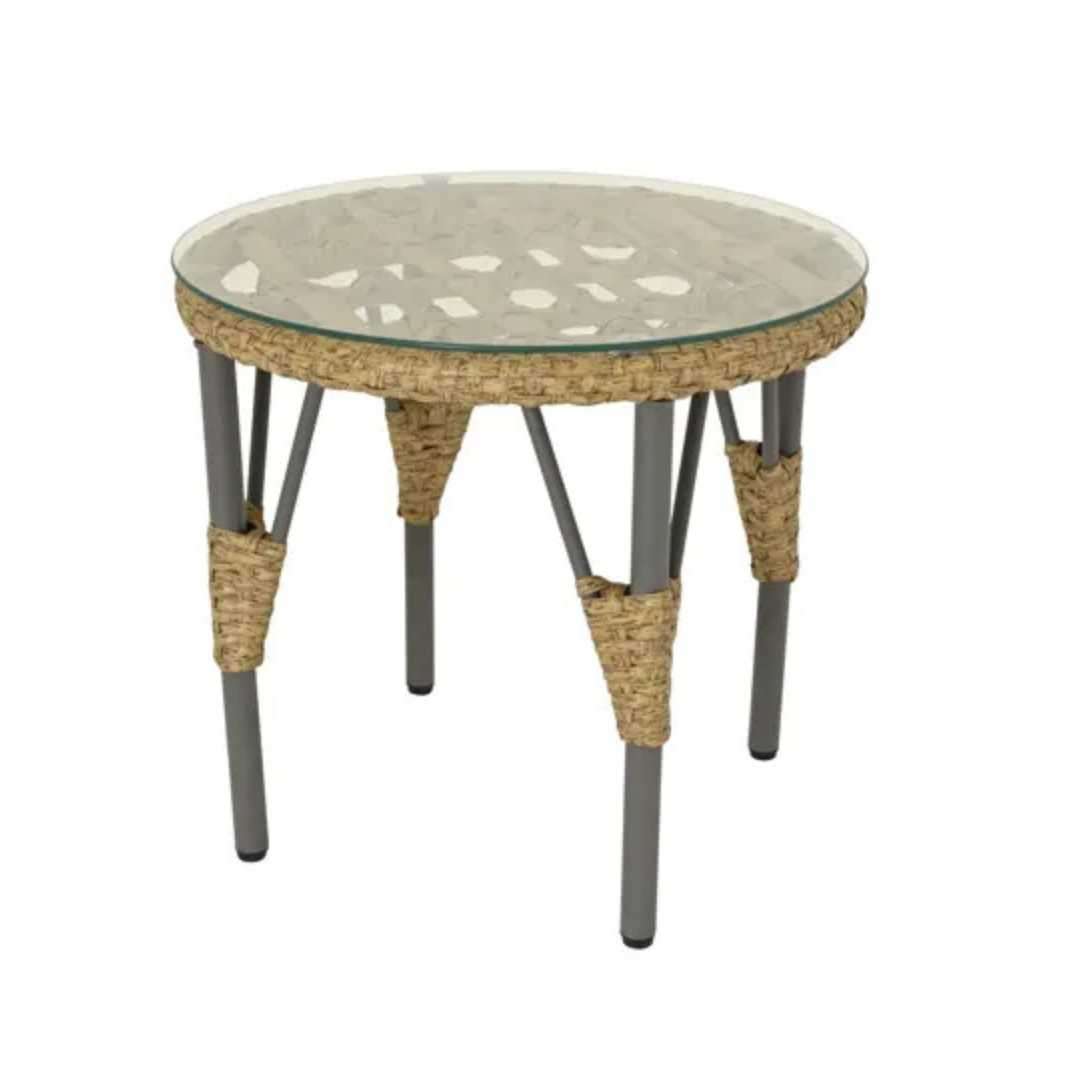 This compact two-seater set pairs a warm natural-toned frame with elegant grey faux wicker and plush grey cushions for a welcoming, well-finished look. The matching glass-top table provides a practical surface for drinks, snacks or morning coffee.