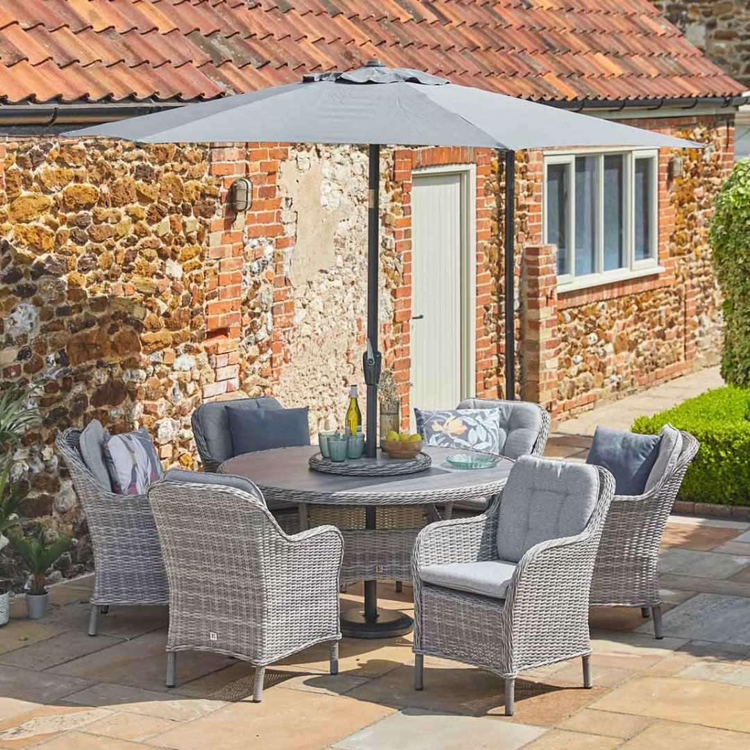 This elegant set includes a spacious, weather-resistant dining table and six comfortable chairs designed for both support and relaxation. Complete with a 2.7m parasol for added shade, it provides the ideal setting for alfresco meals and gatherings.